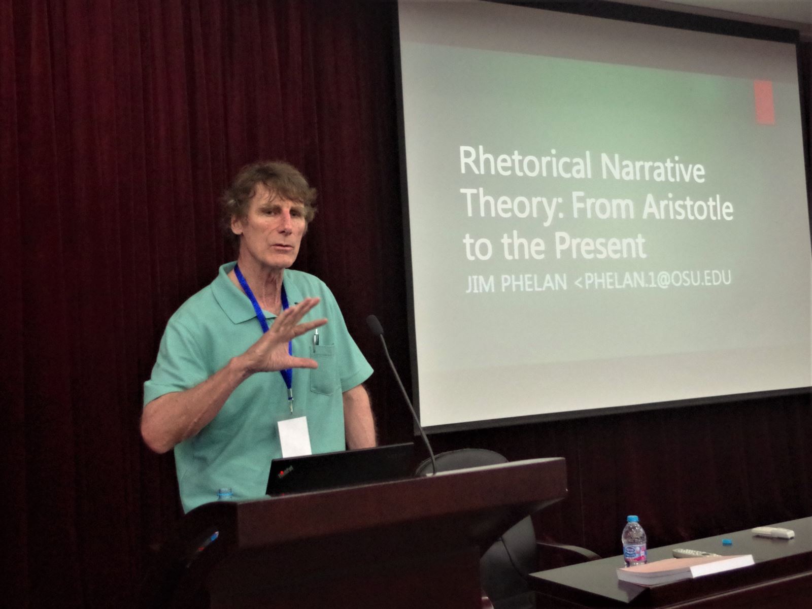 7月16日下午的课程由詹姆斯•费伦教授主讲。费伦教授以“从亚里士多德至今的修辞叙事理论”为主题,系统地讲解了修辞性叙事理论的渊源、流变与发展。他首先回顾了亚里士多德诗学中的核心概念,如悲剧、情节、模仿等。随后,费伦教授转入探讨芝加哥批评学派,他清晰且深入地梳理了芝加哥批评学派发展历程,回顾了克莱恩、萨克斯、布斯、拉德尔等第一代第二代芝加哥学派代表人物的主要思想及理论影响。费伦教授重点介绍了其个人的修辞叙事理论。他在肯定芝加哥学派代表人物之于其个人研究影响的基础上,重点探讨了其修辞叙事理论的“作者”、“资源”与“读者”。