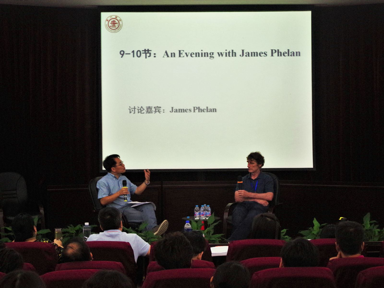 7月16日晚上,会务组精心组织安排了“詹姆斯•费伦之夜”(An Evening with James Phelan)。在这一环节,尚必武教授与詹姆斯•费伦教授以座谈的形式,就叙事学的相关前沿和焦点话题进行了深入的讨论。尚必武教授在座谈中首先对费伦教授个人目前的学术研究中的核心理论做了扼要回顾,并就其中的虚构性、不可靠叙述、叙述交流、叙事伦理等关键点与费伦教授进行激烈而富有洞见的交流,为参会人员提供了一场叙事学的知识盛宴。