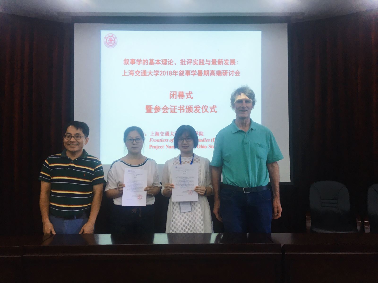 在闭幕式上,詹姆斯•费伦教授、尚必武教授分别致辞,祝贺本次研讨会取得圆满成功,积极展望叙事学的未来发展,并勉励学员将对叙事学的学习和研究作为一项重要的学术事业来追求。随后,费伦教授和尚必武教授为研讨会学员代表颁发了结业证书。两位学员代表分别做了简短的发言,畅谈参加本次研讨会的心得体会。她们表示,三天的学习研讨紧张充实,不仅丰厚了她们对叙事学研究的认知,而且点燃了自己从事学术研究的热情,收获了与学员和授课教师之间的友谊,期待下一届叙事学高端会再相聚。