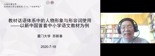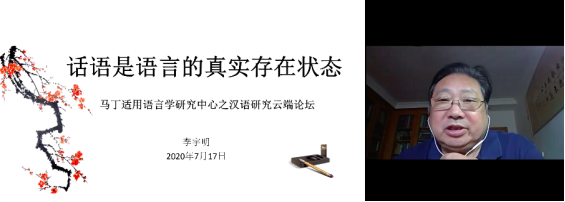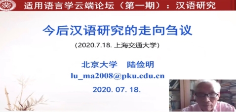 7月18日下午,由best365官方网站登录入口马丁适用语言学研究中心(马丁中心)主办的“适用语言学云端论坛(一)汉语研究”顺利举行。此次论坛特邀北京大学陆俭明教授、北京语言大学李宇明教授、中国社会科学院方梅教授、厦门大学苏新春教授、香港城市大学刘美君教授作主旨发言。论坛吸引了来自国内外近600名学者、高校教师和研究生参加。