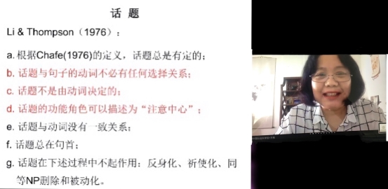 方梅教授的发言题目是“三类汉语式话题句”,由刘美君教授主持。方教授首先引出话题概念在汉语研究中的重要性,她梳理了汉语话题结构相关研究状况,指出了汉语话题研究的焦点问题,如话题与动词的选择关系、话题的功能角色、话题的位置等。接着,她从篇章角度给出了话题的类别,介绍了话题的连续性和测量手段,包括主题、行为、话题/参与者的连续性,以及回数法、歧义法、衰减法三种测量方法。方教授提到,汉语中主语通常为话题,动词可以直接做主语或者话题,但是一些特有的话题结构值得关注,包括非论元名词话题句、“N的V”结构话题句和重动式话题句。方教授例举了这三种话题句的表现形式,考察了它们对先行语境的依赖程度异同,并从话题建立、话题管理和话题延续性角度,讨论了它们作为事件性话题的功能以及在篇章中的分布。最后,方教授提出,以篇章功能为切入点的描写和解释,可以将表达功能与句法形式联系起来,揭示特殊结构的用法规律,以及句法结构的形成动因。