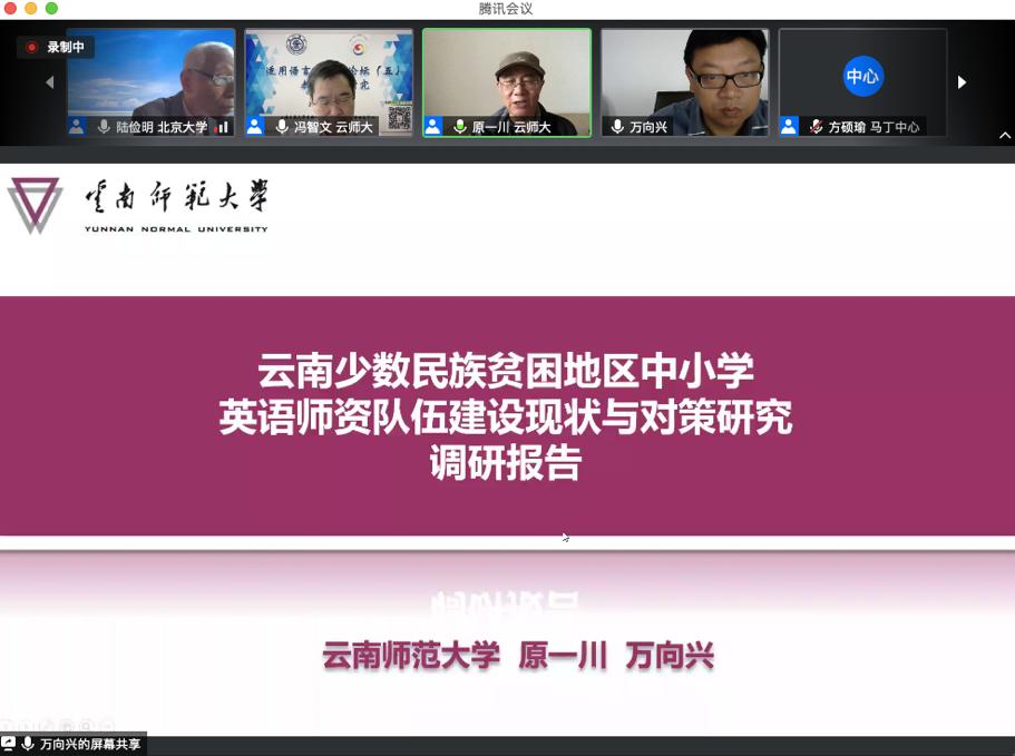 原一川教授的发言题目是“云南少数民族贫困地区中小学英语师资队伍建设现状与对策研究”,由冯智文教授主持。原教授首先对项目的背景内容和进展做了基本介绍,接着由课题组成员万向兴副教授进行调研成果的展示。研究立足云南少数民族贫困地区,通过实证定量问卷调查,了解了该地区中小学英语师资队伍和英语教学现状。万教授指出,云南边疆少数民族贫困地区基础教育阶段的英语师资存在许多问题,包括小学英语教学不重视、部分中学英语教师专业知识和专业能力不强、教师专业发展意识淡薄等。他提出提升英语教师专业水平、加强教师自我发展意识、优质师资引进等具有针对性的策略和建议,力图为少数民族地区“教育扶贫”和“外语教育脱贫”做出贡献。