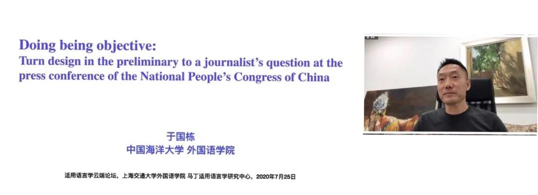 于国栋教授的发言题目是“Doing being objective: turn design in the preliminary to a journalist’s question at the press conference of the National People’s Congress of China”,由赵雪教授主持。于教授运用会话分析理论,从记者招待会机构话语的提问和回答环节入手,聚焦记者对提问背景的话轮设计,探讨了记者与答记者问官员双方间构建的社会行为。于教授首先梳理了会话分析视角下的新闻访谈研究,主要包含话轮转换、中立性和攻击性三方面内容,他强调了问题设计的重要性,记者提问前对背景知识的铺陈不仅建立了与后面问题的相关性,而且还构建了交际的客观性,即做到区分事实与观点。他指出,社会行为、话轮设计和序列组织是会话分析的重要抓手,会话分析视角下的新闻访谈背景设计关注记者如何选择恰当语言成分构建话语,以实现交际客观。于教授发现,记者通过第三方信源构建“观点”陈述,并通过纯粹论断和嵌入论述进行“事实”表达,二者分别实现了不同的交际功能,以适应机构语境。