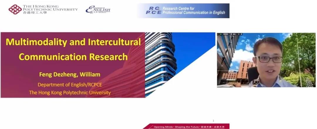 冯德正副教授的发言题目是“多模态与跨文化交际研究”,由瞿桃博士主持。冯教授从系统功能语言学的适用性和多模态分析领域的拓宽出发,引出多模态在跨文化交际研究中的应用,以期了解当代中国的跨文化身份状况。他介绍了三个跨文化概念词Cross-cultural、Inter-cultural和Trans-cultural的所指所含,阐述了三者的不同研究侧重点,即文化差异分析、不同文化背景参与者的互动和全球化背景下的文化杂合三个方面。冯教授从这三个视角出发,结合具体案例讲解了跨文化多模态研究的可行路径,其中,文化差异分析以中美大学官网主页对比为例,在视觉语法框架下量化中美两国文化异同,发掘了多模态分析方法所展现的具体而复杂的文化特征;不同文化背景的参与者互动研究关注商务话语和媒体传播中的言语与非言语行为;文化杂合与同质反映在社交媒体等多模态交际中,冯教授通过分析抖音短视频中的西安形象和斗鱼直播中的网红身份,提出超文化身份的多模态建构综合框架。发言最后,冯教授展望了跨文化交际中多模态中国话语的研究前景,指出其对阐释新媒体影响下的中国社会文化、推动中国文化走出去都具有深远意义。