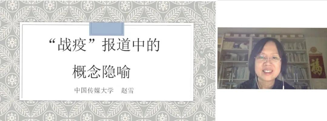 赵雪教授的发言题目是“‘战疫’报道中的概念隐喻”,由于国栋教授主持。赵教授首先例举了抗击新冠疫情报道中概念隐喻的使用情况,并介绍了概念隐喻的理论背景。赵教授借鉴Charteris-Black提出的批评隐喻分析方法,实现对“战疫”隐喻的识别,具体步骤为寻找“备选隐喻主题词”,并参考词典、平衡语料库来确定“隐喻主题词”。她将“战疫”报道中的概念隐喻划分为战争隐喻、动植物隐喻、科技隐喻、空间隐喻、人体隐喻、婚姻隐喻六种类型,考察了各隐喻类型在语料库中的数量和频次占比,重点讨论了战争与“战疫”的相似性。赵教授从隐喻的功能出发,指出战争隐喻突显共性,表现出人类与新冠病毒的对立性以及“战疫”的残酷性和艰巨性,但是遮蔽了“战疫”在应对策略、结局上的特殊性。