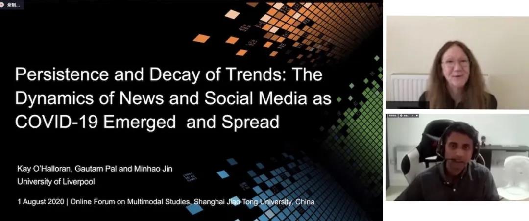Kay O’Halloran教授的发言题目是“Persistence and Decay of Trends: The Dynamics of News and Social Media as COVID-19 Emerged and Spread”,由Louise Ravelli副教授主持。O’Halloran教授通过团队开发的多模态分析平台(MAP),考察了新闻和社交媒体对事件报道的多模态话语建构,以此描述信息传播的增长动态与趋势。她首先指出,多模态研究的最新发展要求建立可行的计算模型,将多模态分析框架与大数据、云计算、自然语言处理、图像视频处理、情境元数据相融合,并且运用于不同数字平台的多模态交际分析,同时她也指出了多模态数字化研究所面临的挑战。接着Gautam Pal博士讲解了多模态分析平台(MAP)部分。他介绍了该平台的科学原理、数据提取与分析流程、平台操作界面等内容,并结合具体分析数据阐释了媒体信息传播特点与趋势。随后O’Halloran教授从近期的新冠肺炎疫情和黑人人权运动切入,展示了基于多模态分析平台的情感取值、热点词云方面的分析结果,揭示了热点话题的动态发展趋势以及社会与媒体的互动关系。