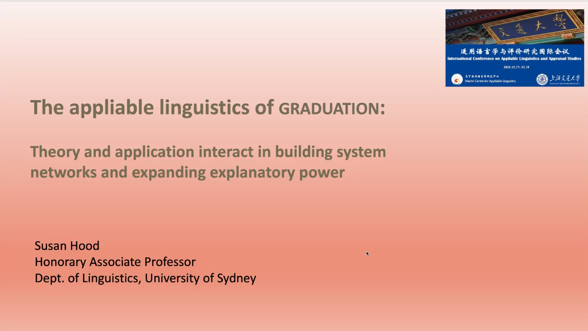 Susan Hood荣誉副教授的报告题目是“The appliable linguistics of GRADUATION: Theory and application interacting in building system networks and expanding explanatory power”,由刘美君教授主持。Hood将作为人际话语语义系统的级差系统运用于探索学术研究写作,主要关注级差系统中的“聚焦”子系统在引发态度方面的作用。Hood讨论了语料中“聚焦”资源的实例化模式及语义韵,总结了出“聚焦”对态度意义的明确(specificity)和满足(fulfilment),并进一步发展了副语言级差系统。