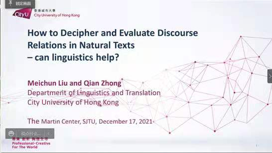 刘美君教授的报告题目是“How to decipher and evaluate discourse relations in natural texts: can linguistics help?”,由杨翕然博士主持。报告聚焦语言学和自然语言处理共同关注的篇章关系论题,基于系统功能语法理论框架,识别了偶发(contingency)、对比(comparison)、时间(temporal)和解释(explanation)四类篇章关系的词汇语法实现手段,探讨了语言学手段对隐式篇章关系的识别和评价及其对机器学习的促进作用。