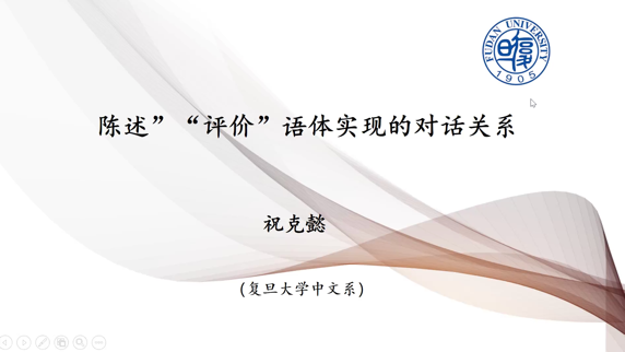 祝克懿教授报告的题目是“‘陈述’‘评价’语体中的对话关系”,由杨信彰教授主持。报告梳理了多元理论视角中的对话关系,通过考察文学评论、新闻评论、学术论文研究综述等写作范式中的对话关系,论证了“陈述”核心语体和“评价”延伸语体间的互文结构关系,推导了人类言语交际活动普遍存在的对话规律。