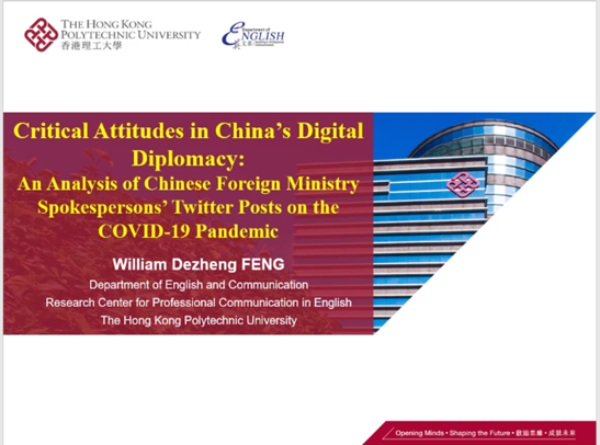 冯德正副教授报告的题目是“Critical attitudes in China’s Digital Diplomacy: An Analysis of Chinese Foreign Ministry Spokespersons’ Twitter Posts on the COVID-19 Pandemic”,由瞿桃博士主持。报告以中方外交部发言人在推特上发帖内容为语料,以态度系统为分析框架,分析发言人的话语策略,发现发言人使用清晰的评价手段、修辞格、认知对比、讲事实摆道理等方法,有力地回击了美国就新冠疫情辱名化中国的不实言论。