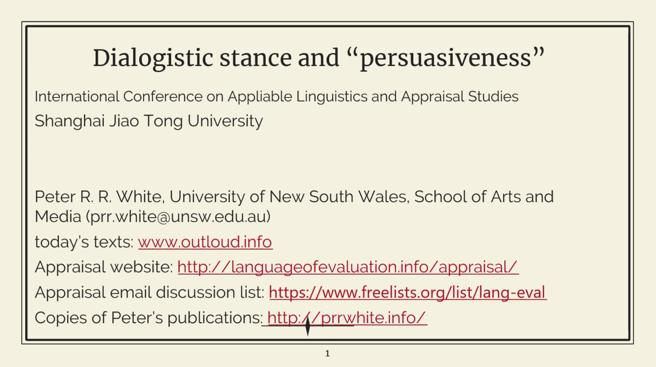 18日下午,新南威尔士大学Peter White博士做了大会发言,报告题目是“Engagement-oriented analyses and the modelling of persuasiveness”,由Susan Hood主持。White的研究从语言学视角将针对“说服”的研究转向“说服力”的研究,并区别文本的“说服力”具有影响文本读者信念、理解和态度的潜在功能。White认为,论点的潜在说服力仅作用于持有相同世界观的读者,同时事件的特定版本也会由读者的价值定位赋予不同程度的说服力。White基于对新闻报道和相应评论的分析,总结认为介入资源的使用影响读者的信念和态度。