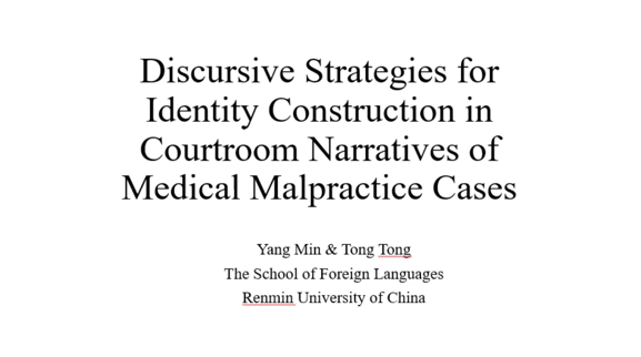 杨敏教授报告的题目是“Discursive strategies for Identity Construction in Courtroom Narratives of Medical Malpractice Cases”,由徐玉臣教授主持。报告聚焦医患纠纷中的庭审叙事策略,建构了庭审叙事中身份建构的分析模型。研究发现,不同的身份建构模式反映出医患双方在评判标准、自我定位和权力关系方面的差异。