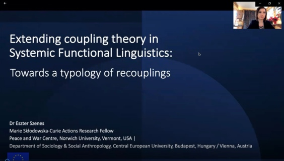 Eszter Szenes博士报告的题目是“Extending coupling theory in Systemic Functional Linguistics: Towards a typology of recouplings”,由瞿桃博士主持。报告结合目前语篇语义系统中的评价系统及概念系统,从实例化层次出发探索本科商业报告中构建商业决策时发挥作用的语言资源。通过在名词词组、小句内、小句复合体及跨句层面讨论不同类型的耦合与再耦合在语法结构上的实现标准,以尝试建构语篇语义层面再耦合的类型学框架。