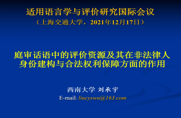 刘承宇教授的报告题目是“庭审话语中的评价资源及其在非法律人身份建构与合法权利保障方面的作用”,由王品博士主持。刘教授探究了庭审各方当事人所使用的评价资源对其在非法律人身份建构和合法权利保障方面的作用。研究彰显了评价系统在庭审话语分析和司法实践中的社会担当及其适用性。