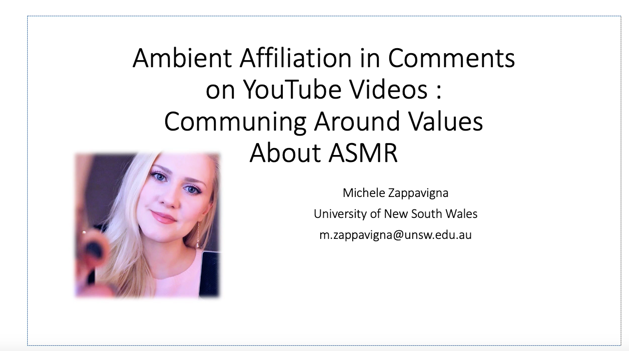 Michele Zappavigna副教授的报告题目是“Ambient Affiliation in Comments on YouTube Videos: Communing Around Values About ASMR”,由王冬燕老师主持。Michele Zappavigna研究了Youtube平台上“自发性知觉经络反应”(ASMR)社群通过评论实现的环境结盟,关注态度和概念耦合的语言资源,提出了聚集型(convoking)、技巧型(finessing)和推广型(promoting)价值共享框架系统。