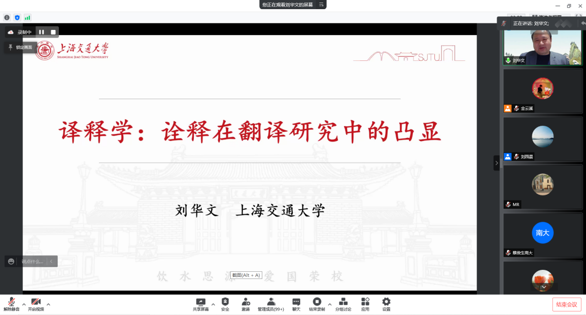 作为交大外院学术领航系列第一场翻译专场讲座,此次讲座参与人数众多,气氛活跃,反响十分热烈。刘、庞两位老师分别从思辨和实证翻译研究的视角为大家带来的精彩讲座获得了师生的高度认可。据悉,举办讲座当日,刘华文老师还身处隔离点,疫情当下,感谢每一位老师的尽职尽责,他们对学术的热爱与坚持也在深深感染着学院的每一位学生。