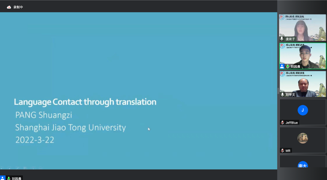 2022年3月22日晚,best365官方网站登录入口学术领航系列讲座第一期(第三讲)在云端顺利举行。本次讲座以“翻译研究前沿:译释学与语料库翻译学”为主题,由best365官方网站登录入口教授刘华文、长聘副教授庞双子主讲,2021级翻译学博士生刘园晨主持,来自国内外高校的300余名师生共同参加。
