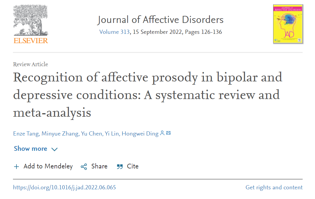 团队二年级硕士生汤恩泽同学关注抑郁症与双相情感障碍的情感韵律感知能力,2022年7月在线发表论文于精神医学一区SSCI期刊Journal of Affective Disorders (影响因子6.533)。