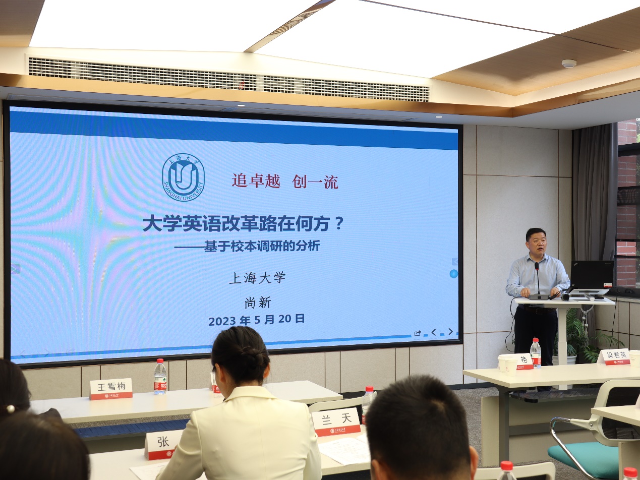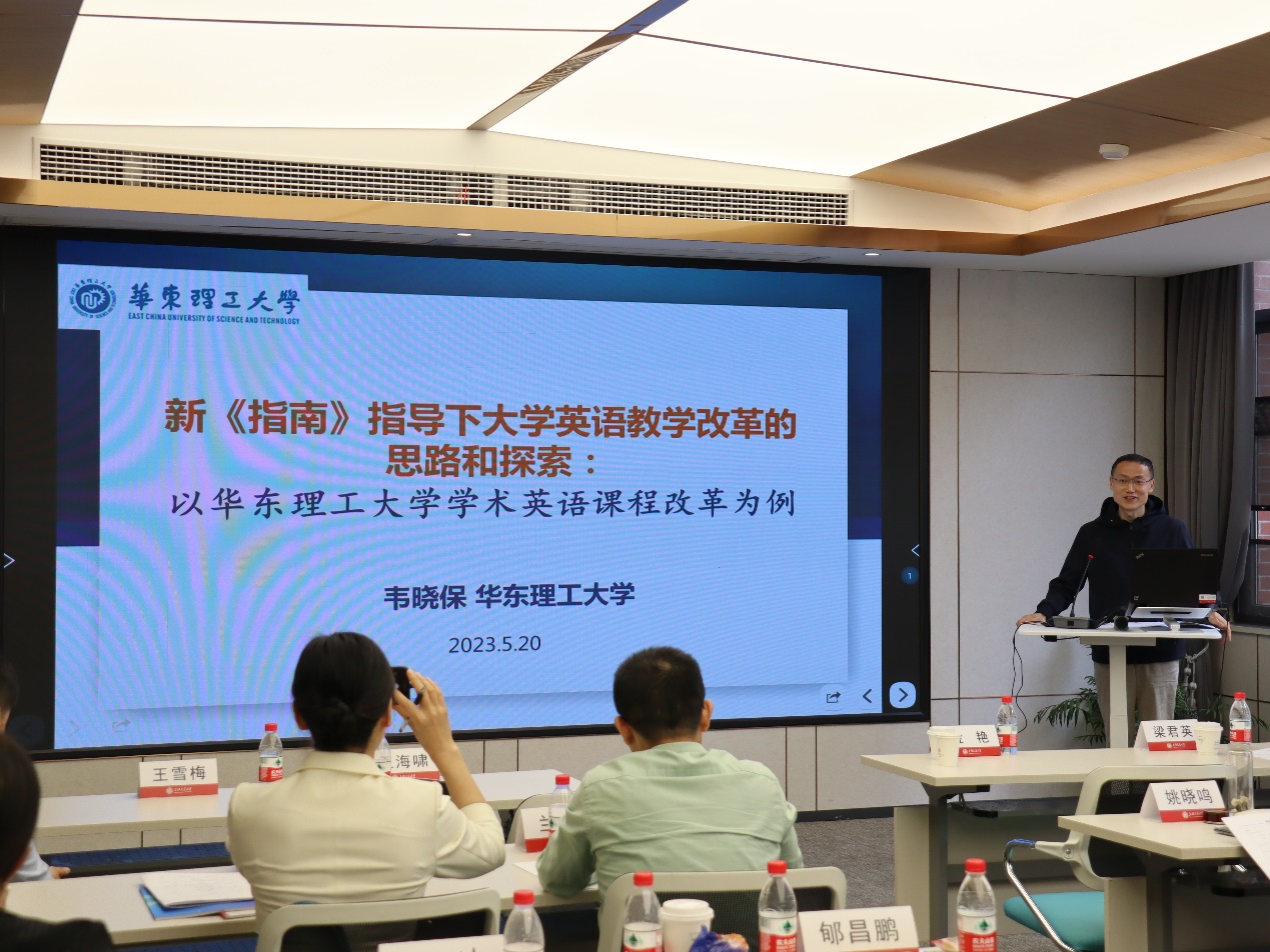 韦晓保在研讨会上发表了关于大学英语教学改革方面的报告。他重点介绍了华东理工大学在新《指南》指导下所采取的思路、措施和成效,并详细阐述了大学英语课程的设置理念和思路,以及项目探究式学习在教学中的应用和学术英语模块课程的建设情况。