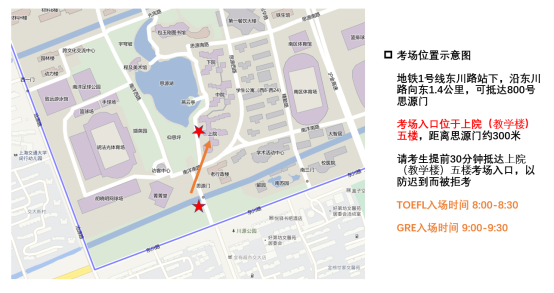 二、所有考生请从上海交通大学闵行校区东川路800号思源门入校,考场入口位于上院(教学楼)五楼,距离思源门约300米。(如图所示)