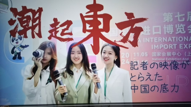 本次比赛的决赛题目为“我眼中的新国潮”,要求参赛队伍在题目发布之后三天内提交作品。尽管时间紧、工作量大,但日语系参赛团队团结合作,充分发挥了日语实践能力和传播技能,高效、高质地准时完成参赛视频作品《潮起东方》。作品以进博会为背景,展现国货之潮,同时以青年记者的身份作为贯穿视频的主线,展现国力之潮,彰显了年轻人的文化自信自强。在决赛现场答辩时,日语系团队也凭借流畅优美的日语表达自如地应对评委的提问,赢得了评委和观众的一致认可,最终荣获二等奖。