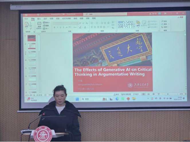 王倩以“Examining the Effect of Generative AI on Critical Thinking in Argumentative Writing”为题,探讨了生成式AI对英语学术写作的影响。人工智能时代下生成式AI在学术写作中的广泛应用引发了对学生独立分析能力影响的担忧。对此,她的研究探讨了生成式AI工具AWESOM在大学英语课堂中的应用,旨在评估其对促进学生议论文写作中思辨思维发展的有效性。