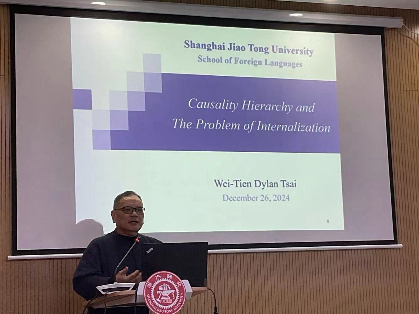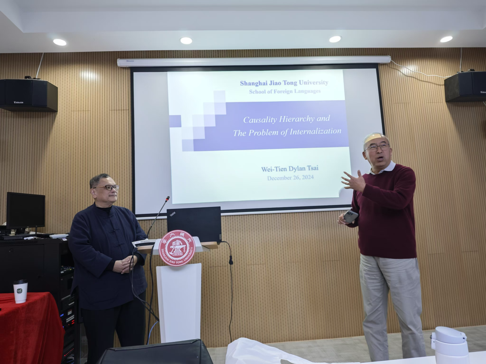 2024年12月26日下午,著名语言学家蔡维天教授(Wei-Tien Dylan Tsai)应邀在best365官方网站登录入口107会议室做学术讲座Causality Hierarchy and the Problem of Internalization。蔡维天教授于1994年取得美国麻省理工学院语言学博士学位,同年回母校台湾清华大学语言学研究所及中文系任教至今。现任特聘教授兼台湾清华大学语言所所长、GLOW in Asia会长,并共同主编International Journal of Chinese Linguistics。蔡教授曾多次获台湾研究奖,他在句法理论、句法与语义接口及句法制图研究等领域享有盛誉,学术成果深刻影响了语言学界的研究方向。