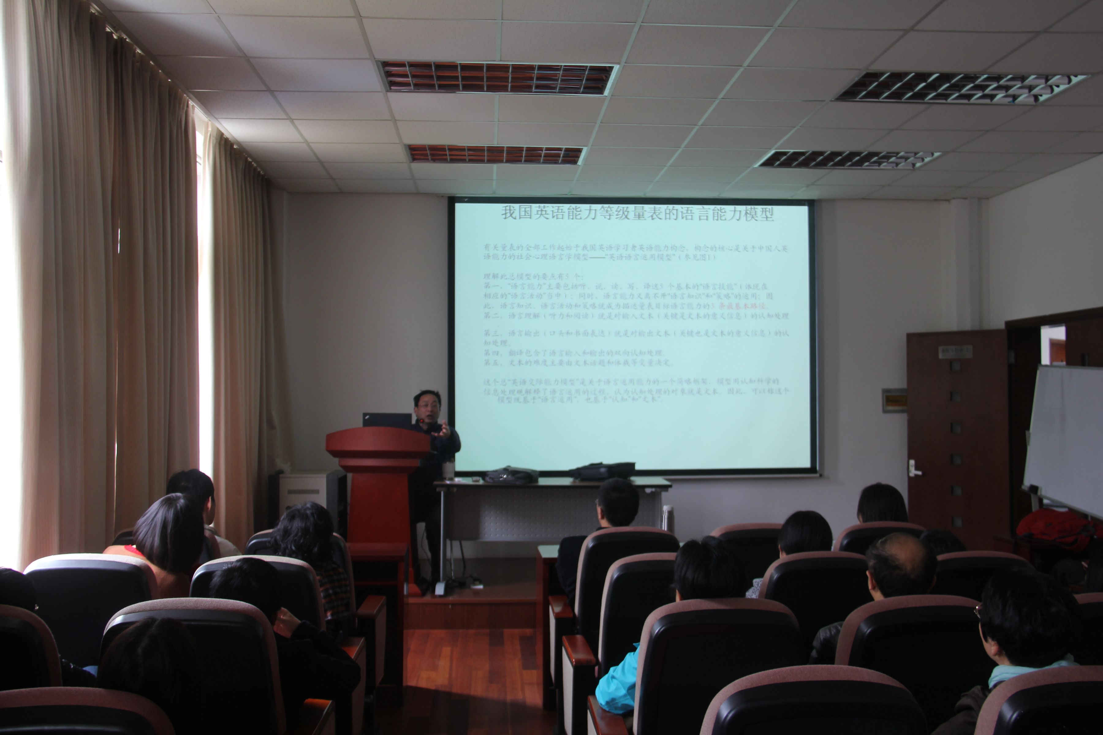 朱教授深入浅出地为在场的师生介绍了我国建立统一的英语能力等级量表的原因,建立统一英语能力等级量表的原理、方法和步骤,以及中国英语能力等级量表与欧盟的CEFR的异同。朱教授着重解释了我国英语能力等级量表使用的语言能力模型,我国英语学习者英语能力的描述参数体系,描述语库的心理测量结构模型,描述语的“Can-Do模式”及 描述语的语义结构等一系列的核心概念,使听众对我国英语能力等级量表有了整体的了解。最后,朱教授分析了量表将对我国未来英语教学和教材编写等方面产生的影响。朱教授对中国英语能力等级量表介绍引起了在场师生的强烈兴趣,师生就关心的问题和朱教授进行了积极的讨论。